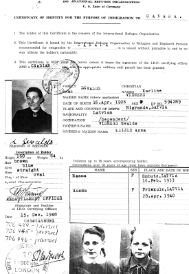 Ausma Levalds was Canada's 50,000th displaced person welcomed into Canada after the Second World War, brought by the international Refugee Organization. She came through Pier 21 in February 1949. Ausma was 8 years old when she came with her mother Karline Levalds and her sister Rasma. Following her father, Janis Levalds who emigrated a year before to Canada.