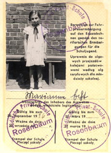 My grandfather lived in a town in East Prussia. When we knew that we were going to Canada we, that is my father, my mother and I, went to my grandfather's by bus to say good-bye to them. Our journey was quite pleasant until we came to the Danzig border. There, an officer looked at our passports and asked if we had much money with us. As we were going to my grandfather's, we did not need any money and so we could truthfully say that we hadn't any. But, because we were the only people in the bus who did not wear a swastika, the officer thought we were anti-Nazis. My father was the only one who had to leave the bus and the officer took him into a very small room. There he said to another officer: "Now we've got one." My father said: "perhaps you think that everyone who does not wear a swastika is a criminal!" The officer replied, "We'll see." The room into which my father was brought was so small that he could not even move his hand so he could take his handkerchief to blow his nose. He had to stand with his arms above his head while the officers looked into all his pockets and other places, but, of course, could not find anything. Now we thought everything was over and we could finish our journey in peace, but we were greatly mistaken. We now crossed the Nougat River and with that we entered into Germany. We were noticed again, mainly, because we had no swastika, but also because the Danzig officer had telephoned to the German officer and had told him to annoy us. Here, we all had to go out of the bus. They looked at all our things, and as we had some sandwiches with us, they opened them, took off the meat and the other things which were on the sandwiches, scratched off the butter and looked through the bread with the help of a flashlight. Next, they found my autograph book. They asked us why we have it with us, and my father said that we were to go to another country and that I wanted my relatives autographs before we leave. When the officer opened the book, he saw the following, which was written by my mother: "if a poor man begs of you, give him something; if someone is sick, comfort him; if someone has died, put him into his grave; do not ask what his rank and religion are, he is a man like you." The officer looked at us; then he closed the book and threw it at us. He did not say anything. Probably he saw by the verse how a person should act. However, a second officer came and took my mother to a woman who had to undress her completely, and looked at all her things to see if she had anything with her which she was not allowed to have. They cut my mother's girdle into pieces, ripped the hem and seams of her dress and cut the soles off her shoes; but they were polite enough to paste the soles on again. In another room they did the same thing to my father. Strange to say, they did not touch me at all. The bus was two hours late on account of the interruption. The other people in the bus were angry and said that they, who had butter and eggs and many other things, were not examined, and we who did not have anything were being inspected for two hours or more.