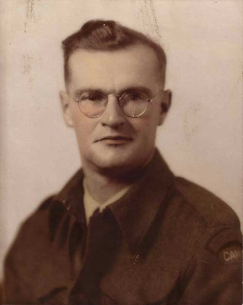 He enlisted in the Canadian Army at the age of 29 as a Private on April 10, 1943. He was assigned to the No. 6 District Depot, for the Halifax Military Hospital, Royal Canadian Army Medical Corps (R.C.A.M.C.). He completed initial training on April 29 and was transferred to No. 60 Basic Training Command at Yarmouth, Nova Scotia. He completed his training on June 30.